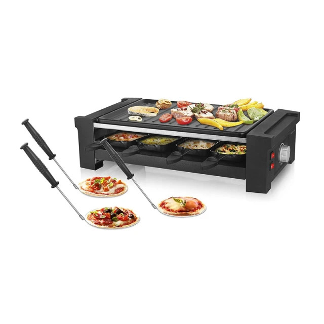 گریل راکلت برقی، از شرکت Emerio، به شما امکان میدهد پیتزا، سبزیجات و گوشتهای مختلف را کباب کنید و پنیرهای مختلف را بدون نیاز به استفاده از دستگاههای مختلف، آب کنید. دارای صفحه پخت نچسب با قابلیت تنظیم دما از طریق دکمه چرخشی .