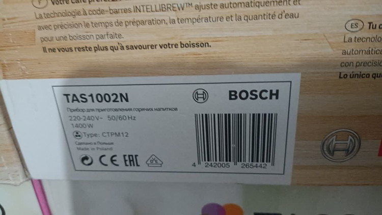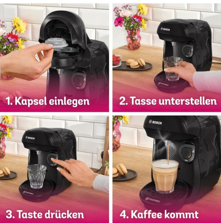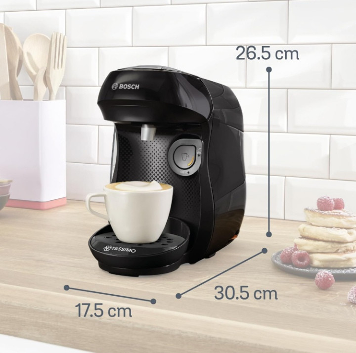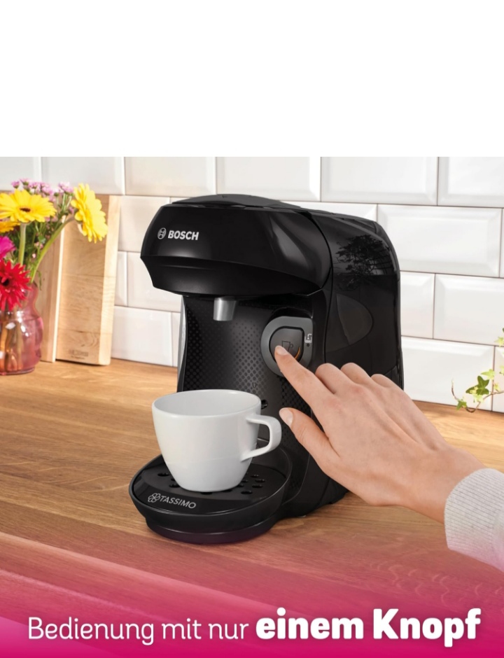 برند و مدل : بوش تاسیمو هپی TAS1002N. نوع محصول: دستگاه قهوه ساز کپسولی، نوع قهوه ساز: تمام اتوماتیک، نوع ورودی قهوه: کپسول قهوه، مخزن قهوه: فنجان، ظرفیت فنجان: ۱ فنجان. توان: ۱۴۰۰ وات. رنگ محصول: مشکی